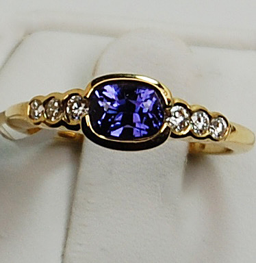 18kt yellow gold ring with 1=1.17 ct purple sapphire and 6=0.20 ct diamond.
